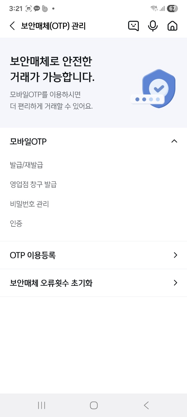 모바일 OTP는 보안카드를 대체하는 방식이에요. 이게 있어야 이체나 인증이 가능합니다.