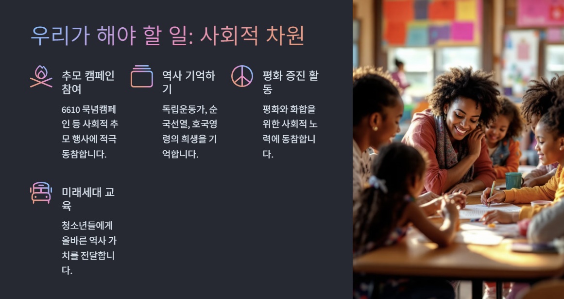 아이들이 학교에 가고, 우리가 자유롭게 생각하고 말할 수 있는 이 풍경은 누군가의 희생 위에 놓여 있음을 기억합시다.