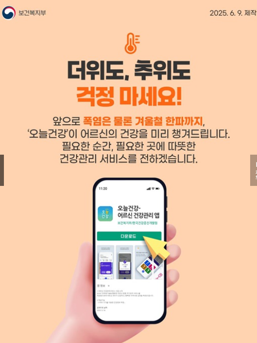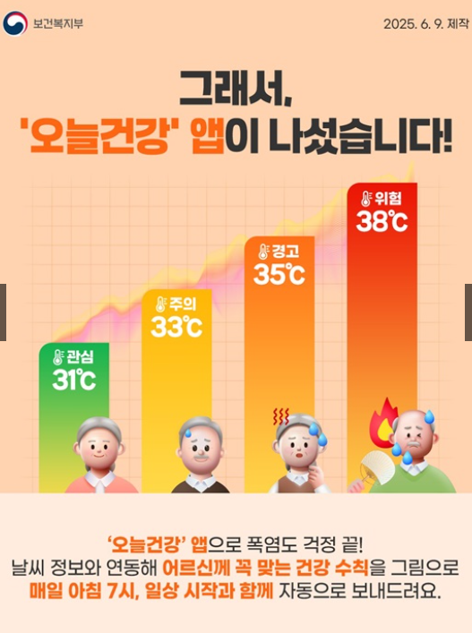 2025년 6월 10일, 보건복지부는 더욱 길어진 여름과 심화되는 기후 위기에 대비해, 어르신 건강을 안전하게 관리하는 '오늘건강' 앱 서비스를 본격 확대한다고 발표했습니다.