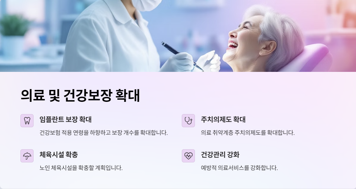 - 기초연금 감액 폐지 및 의료 접근성 강화