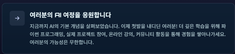지금까지 AI의 기본적인 개념들을 살펴보았습니다. 이제 여러분은 AI 세계로 첫발을 내디딘 셈입니다. 더 깊이 공부하고 싶다면, 파이썬 프로그래밍을 익히고, 실제 머신러닝 프로젝트에 참여해보는 것을 추천합니다. 온라인 강의, 전문 서적, 커뮤니티 활동을 통해 지속적으로 학습하고 경험을 쌓아나가세요. 여러분의 AI 여정을 응원합니다.