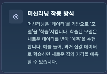 머신러닝은 '데이터'를 먹고 자랍니다. 이 데이터에는 우리가 모델에게 학습시키고 싶은 특징들이 포함되어 있죠. 우리는 이 데이터를 사용하여 '모델'을 '학습'시킵니다. 학습된 모델은 새로운 데이터를 받으면, 학습한 내용을 바탕으로 '예측'을 합니다. 예를 들어, 과거 집값 데이터로 학습한 모델은 새로운 집의 특징을 보고 가격을 예측할 수 있습니다.
