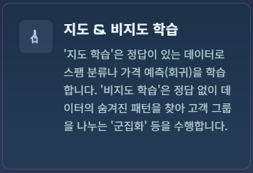 머신러닝에는 크게 '지도 학습'과 '비지도 학습'이 있습니다. 지도 학습은 정답이 있는 데이터를 통해 학습하는 방식입니다. 예를 들어, 스팸 메일과 스팸이 아닌 메일을 구분하는 '분류' 문제나, 주택 가격을 예측하는 '회귀' 문제가 대표적입니다. 비지도 학습은 정답 없이 데이터 자체의 숨겨진 패턴을 찾아내는 방식입니다. 고객 그룹을 나누는 '군집화'가 좋은 예시죠.