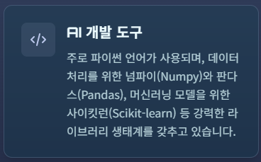 AI를 개발하기 위해서는 파이썬과 같은 프로그래밍 언어가 주로 사용됩니다. 파이썬은 데이터 처리와 AI 모델 구축에 필요한 다양한 라이브러리들을 제공합니다. 넘파이, 판다스는 데이터를 다루는 데 유용하고, 사이킷런은 다양한 머신러닝 모델을 쉽게 사용할 수 있게 해줍니다. 지금 당장 코드를 작성할 필요는 없지만, 이러한 도구들이 있다는 것을 알아두시면 좋습니다.